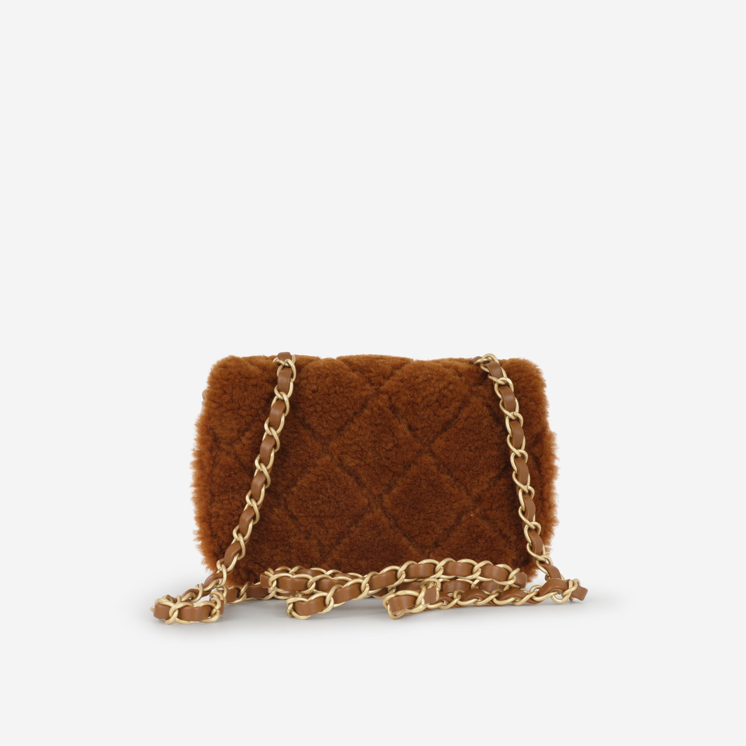 The Chanel Teddy Bear-Shearling Flap Bag combines playful charm with luxury. Crafted from soft shearling in a warm teddy bear brown, it features the signature interlocking “CC” logo and gold-tone hardware. This distinctive bag blends comfort and sophistication, making it a unique statement piece for any collection.