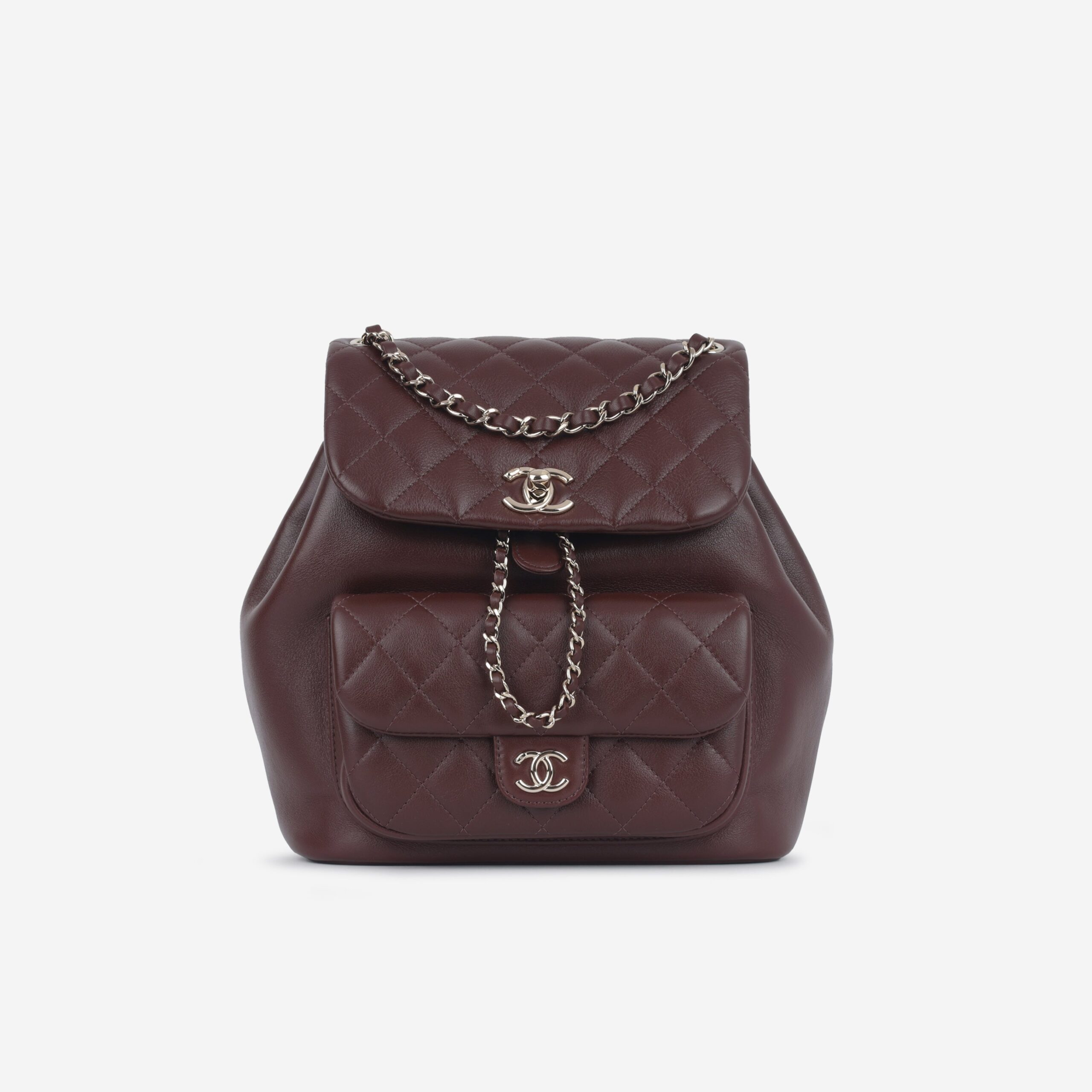 Carefully crafted from quilted lambskin leather, Chanel presents their Duma backpack. Petite and sweet, this bag makes for a chic piece to take around with you throughout the day. It features Chanels classic interwoven back straps along with top handles to carry it handheld.