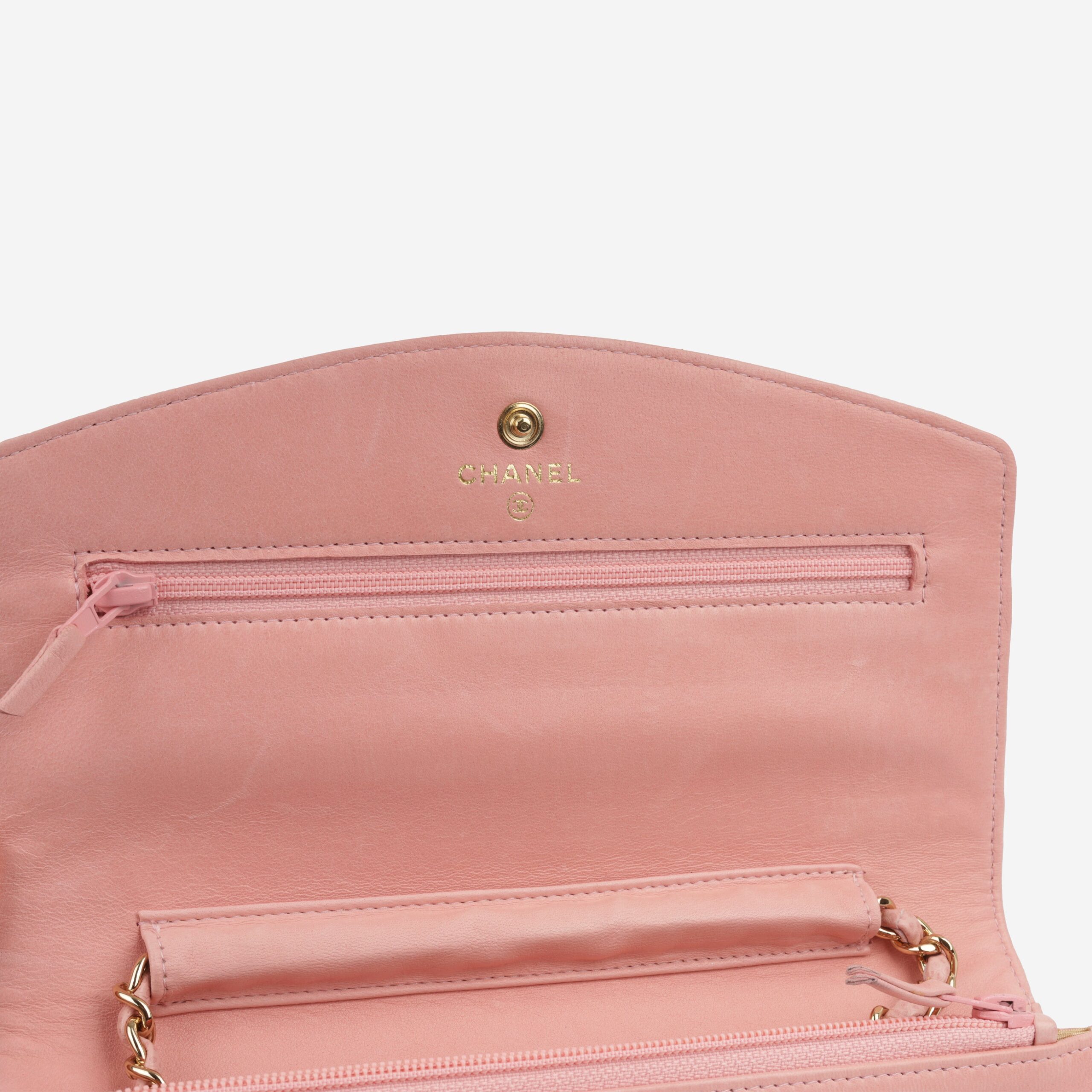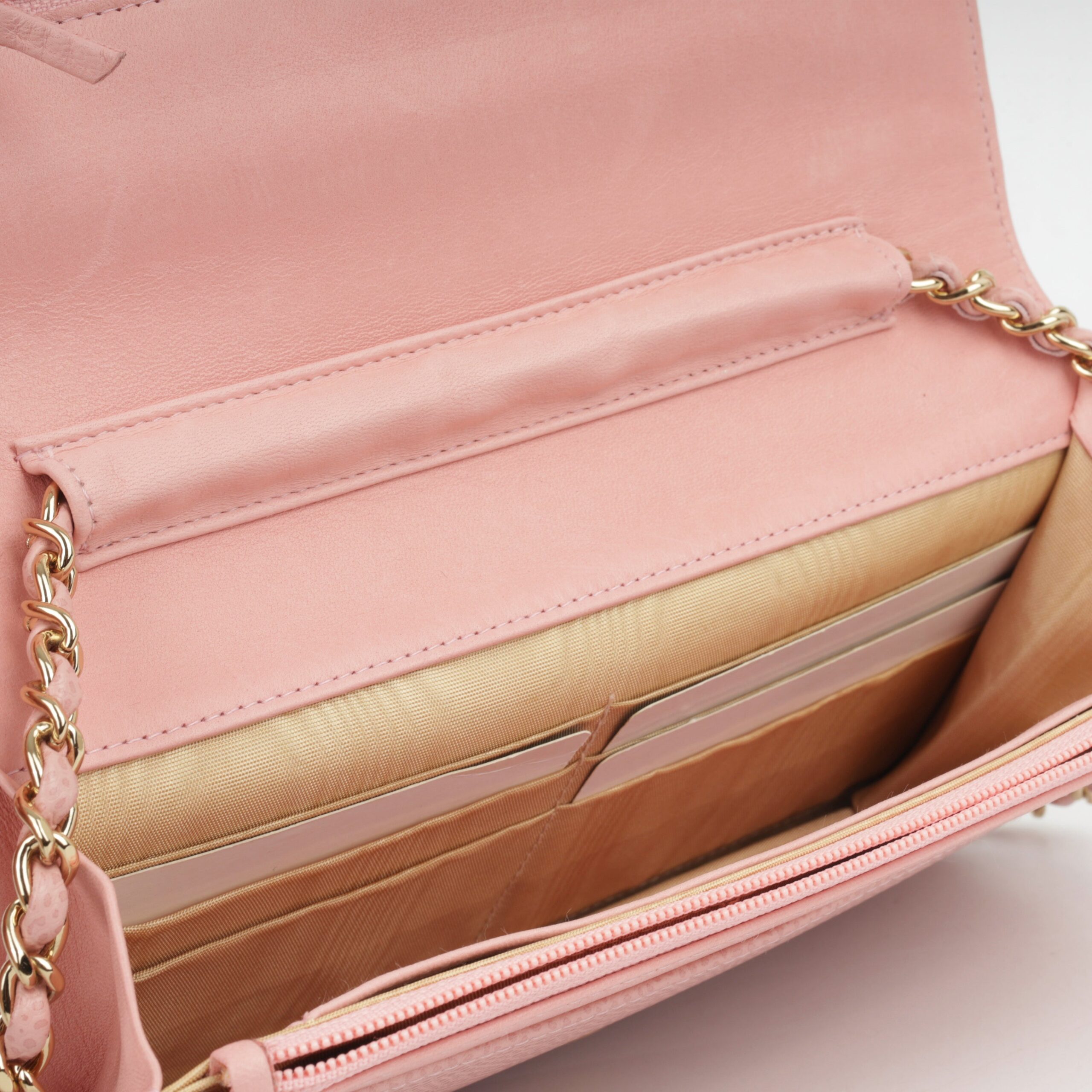 - Pink lambskin / gold fabric lining