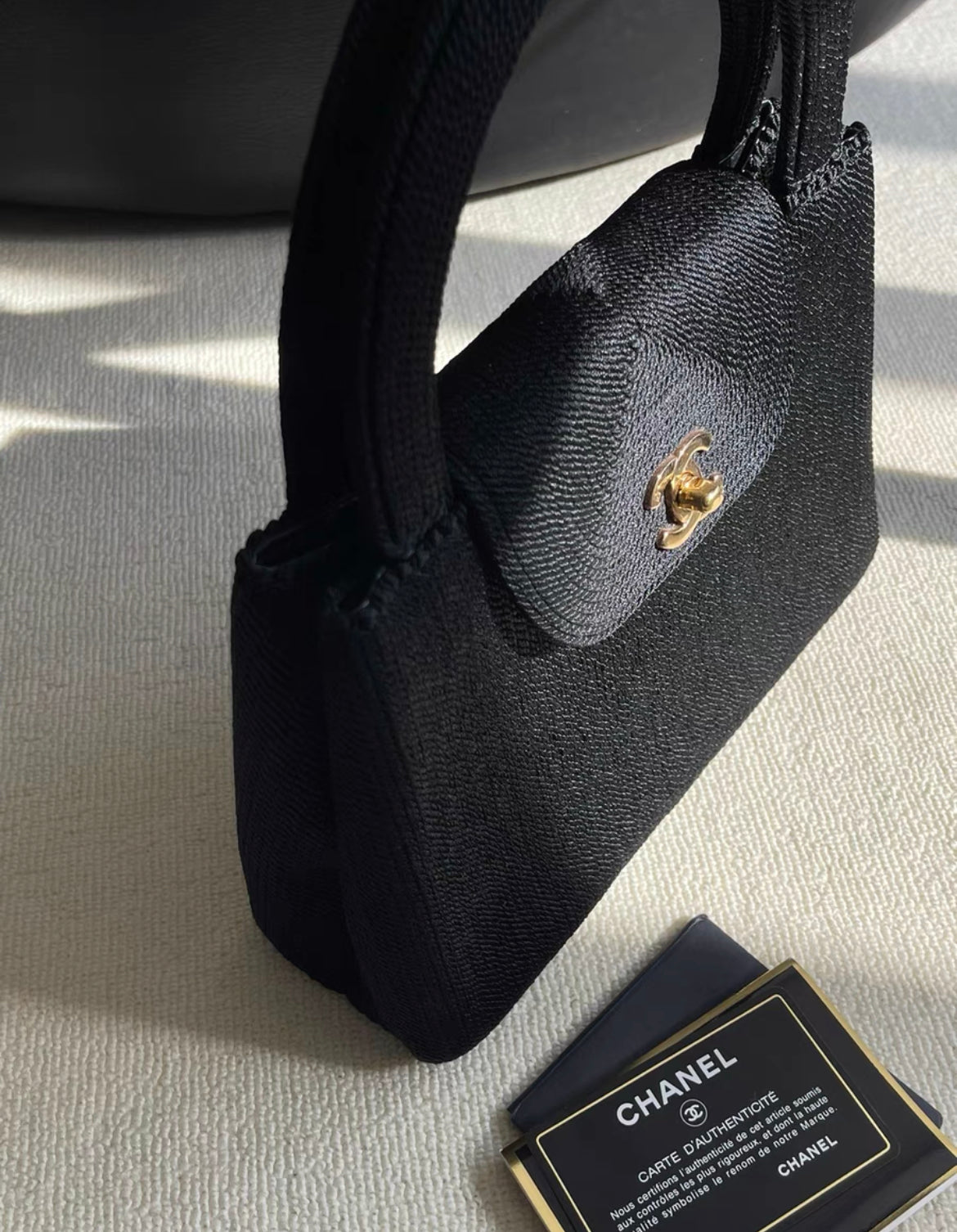 As a vintage Chanel treasure, the 1997 Vintage Silk Rope Raffia Mini Kelly Evening Bag boasts 24k gold hardware and a tightly spun roped silk raffia material that shines against the light. With two oversized “cutout” handles and a small flap with a turnlock CC clasp, this mini kelly is perfect for chic evening events. The main compartment is lined in lambskin and has two side pockets, making it both stylish and functional. A rare and collectible piece for any Chanel maven’s closet.