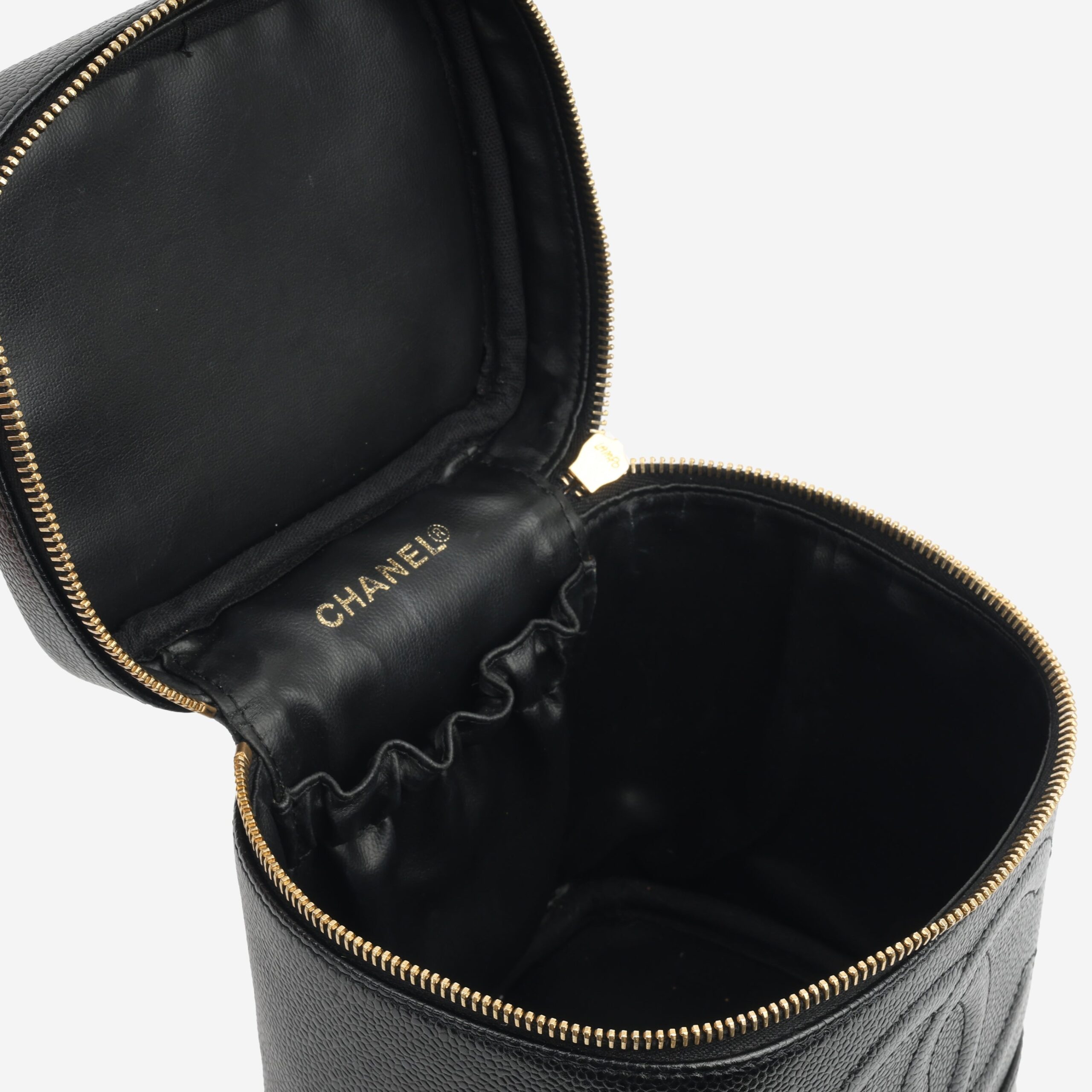 Chanel’s vintage collection presents one of its highly sought and rare gems, the Vintage Vanity Case. Primarily developed for storing your tiny beauty essentials and other small necessities, the vanity case has come a rather long way since its birth. This vanity case is presented in gorgeous black calfskin leather alongside complimentary gold toned hardware.