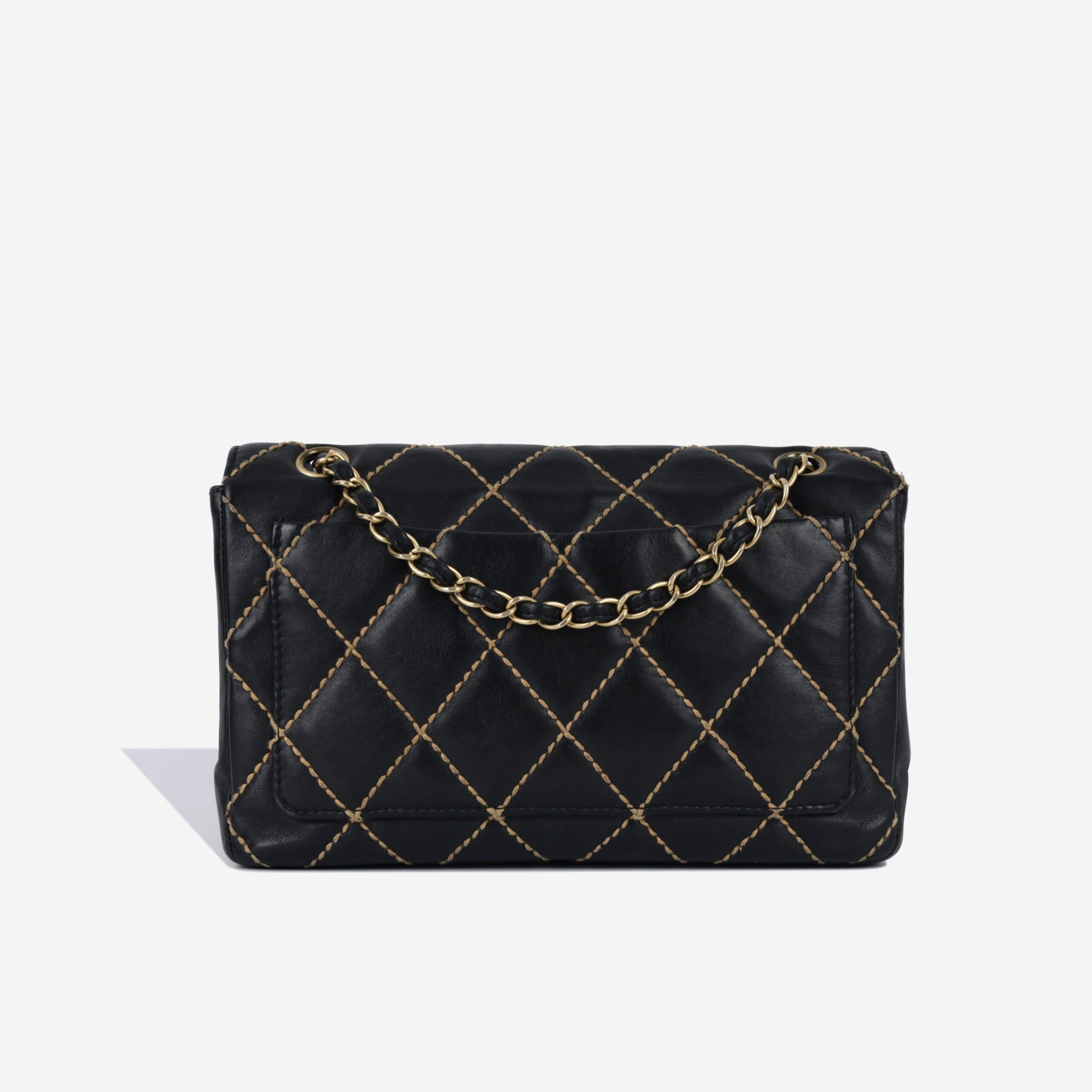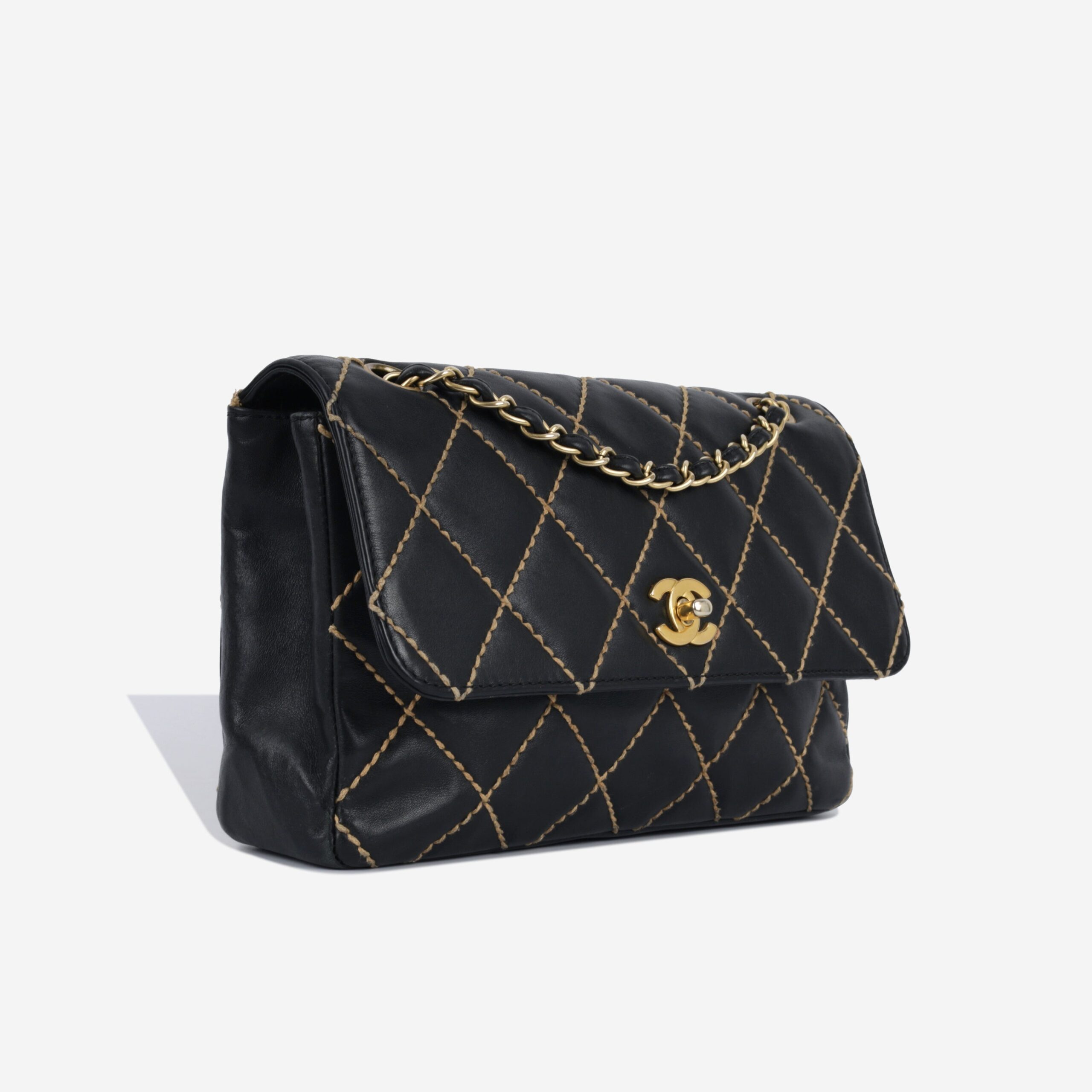 This beautiful piece is a slight variation on Chanels classic flap. Created from black calfskin leather, this bag features beautiful thicker stitching which adds dimension to this bag. In a similar size to the classic medium, it is the perfect size for taking with you day to day and fit your belongings comfortably.