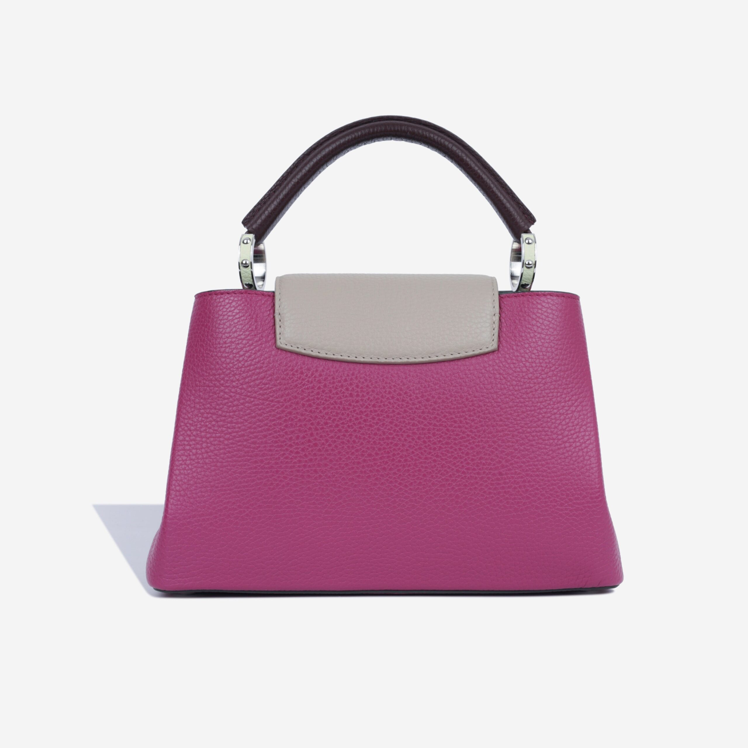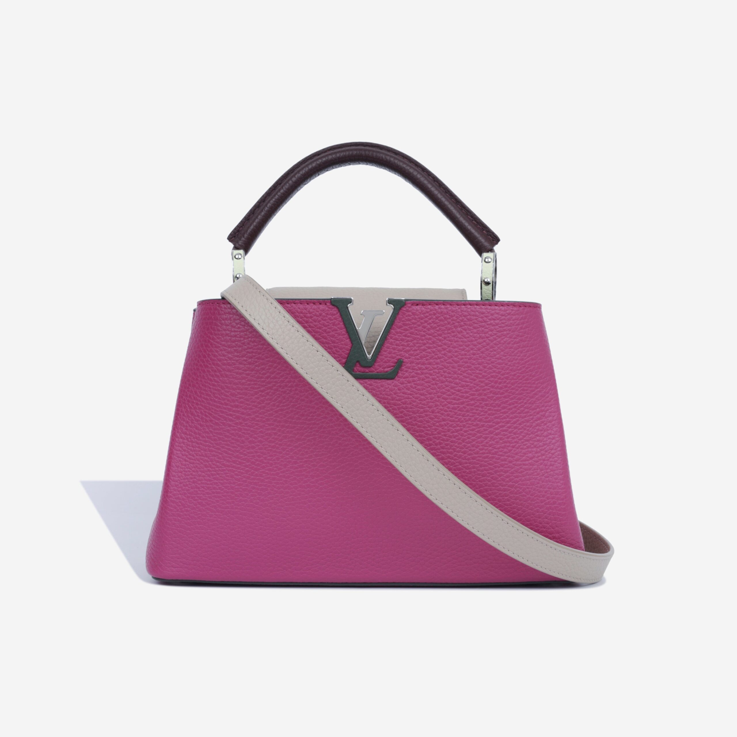 The Capucines BB by Louis Vuitton is the perfect city chic bag. With modern lines and bold statement colours, this will stand out from the crowd. The Capucines line takes its name from the Rue des Capucines in Paris, where Louis Vuitton opened his first store in 1854. Wear the flap on the outside to show the monogram flower, or tuck the flap into the top compartment to reveal the LV initials in stunning silver hardware.