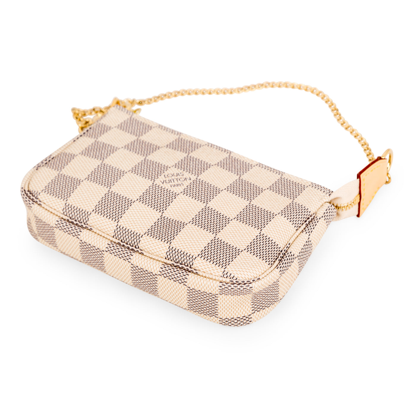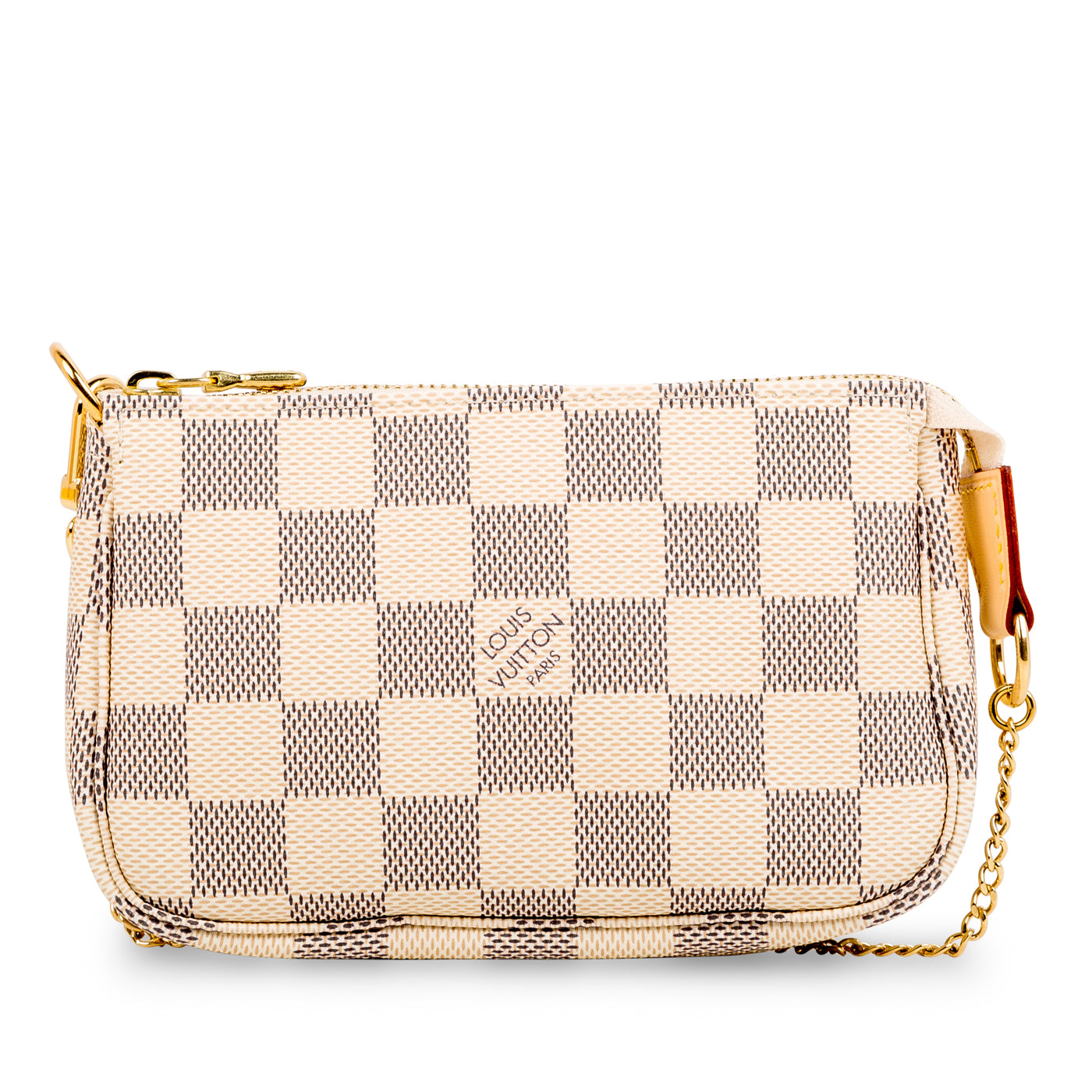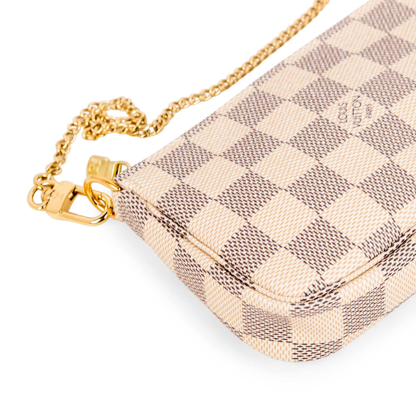The Pochette is a petite accessory perfect to add to your Louis Vuitton day bag or simply wear it by itself if you only need a few items! The Pochette comes in the iconic Louis Vuitton damier Azur print recognisable anywhere. The gold chain that is attached as the top handle also detaches from one side, enabling you to hook it onto other accessories. Style your mini Pochette with your Louis Vuitton day bag.